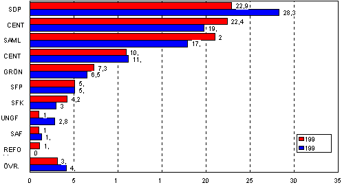 Väljarstödet för partierna i riksdagsvalet 1999 och 1995