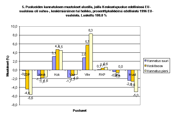 Puolueiden kannatuksen muutokset alueilla, joilla Keskustapuolue edellisissä vaaleissa oli vahva, keskimääräinen tai heikko