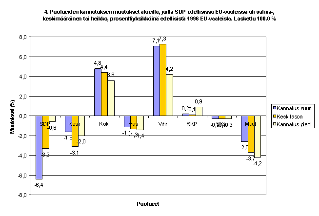 Puolueiden kannatuksen muutokset alueilla, joilla SDP edellisissä vaaleissa oli vahva, keskimääräinen tai heikko