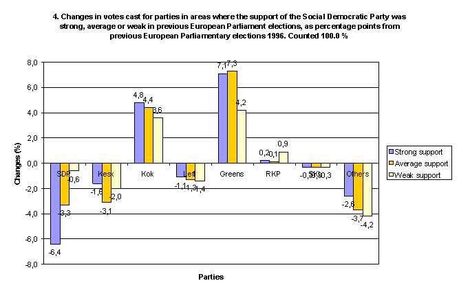 Changes in votes cast for parties in areas where the support of Social Democratic Party was strong, average or weak in previous European Parliament elections