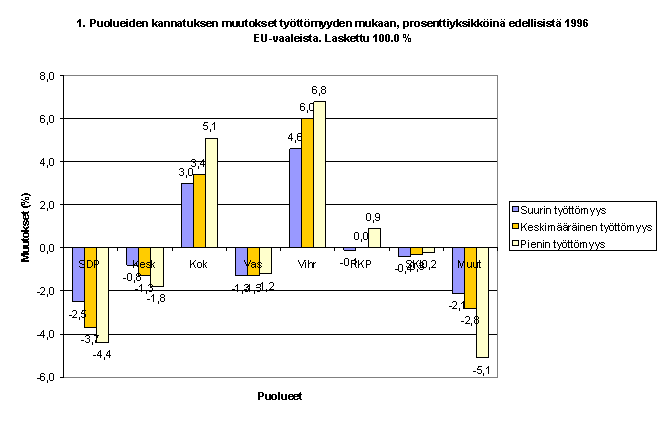 Puolueiden kannatuksen muutokset työttömyyden mukaan