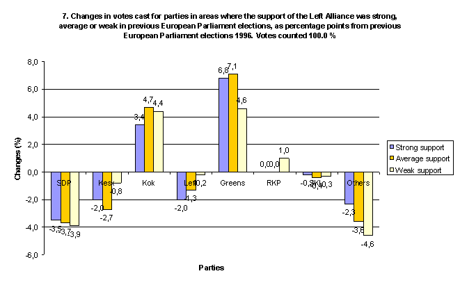 Changes in votes cast for parties in areas where the support of the Left Alliance was strong, average or weak in previous European Parliament elections