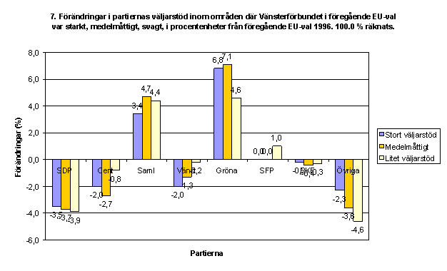 Förändringar i partiernas väljarstöd inom områden där Vänsterförbundet i föregående EU-val var starkt, medelmåttigt eller svagt
