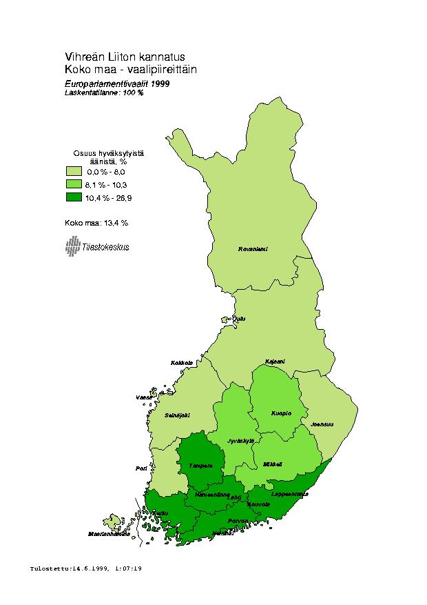 Vihreiden kannatus vaalipiireittäin