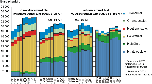 Vuosina 1995-2001 maataloustulo on alentunut reaalisesti kaikissa tilaryhmissä. Pienimmillä ja osa-aikaisemmilla tiloilla viljelijäpuolisoiden tulotaso on voitu säilyttää ja sitä jopa hieman korottaa palkkatuloja lisäämällä. Suurimmilla ja päätoimisimmilla tiloilla maataloustulon vaihteluita on voitu tasoittaa jossain määrin metsätuloilla. Kokonaistulojen taso on alentunut selvästi 50-100 hehtaarin tiloilla. Yli 100 hehtaarin tiloilla omaisuustulot ovat huomattava tuloerä, ja niiden avulla on voitu säilyttää kokonaistulojen taso.
