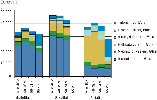 Viljatiloilla maataloustulo on nuorten tilaryhmässä hieman muita suurempi, mutta alemmista palkkatuloista johtuen nuorten kokonaistulot jäivät kuitenkin vakiintuneempien viljelijöiden tuloja alemmalle tasolle. Maataloustulo peltohehtaaria kohti oli nuorten viljelijöiden viljatiloilla keskimäärin 208 euroa ja vanhimpien tiloilla 295 euroa. Vanhimpien viljelijöiden tiloilla palkkatulot ovat korvautuneet eläketuloilla. Niillä kokonaistulot muodostuivat suunnilleen samansuuruisiksi niin maito- kuin viljatiloillakin.