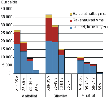Maatalouden investointimenot ovat olleet suurimmat nuorimpien viljelijöiden tiloilla. Tilan oston lisäksi nuorten tiloilla tehdään eniten tilan kehittämiseen ja laajentamiseen liittyviä investointeja. Edelliseltä sukupolvelta on lisäksi voinut siirtyä laiminlyödyistä korvausinvestoinneista johtuvaa investointitarvetta. Myös muiden alle 50-vuotiaiden vakiintuneempien viljelijöiden tiloilla on tehty keskimääräistä enemmän varsinkin rakennusinvestointeja. Yli 50-vuotiaiden tiloilla investointien määrä alenee oleellisesti etenkin kotieläintiloilla. Sikatiloilla on yleensäkin investoitu enemmän kuin maito- tai viljatiloilla (Kuvio 3).