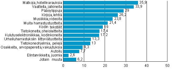 Alle 40-vuotiaat hankkivat nettikaupoista pääasiassa musiikkia, elokuvia tai videoita sekä vaatteita ja jalkineita. Yli 40-vuotiaiden ostoslistalla oli nuorempia useammin matkoja ja hotellivarauksia.