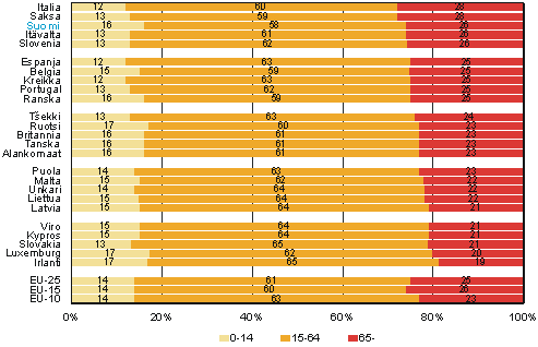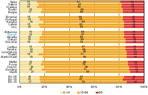 Kuvio 1a. EU-maiden ikärakenne 2003, 0-14-, 15-64-, ja 65-vuotiaat