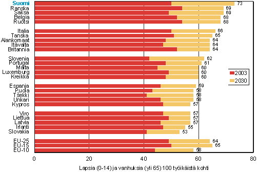 Kuvio 3. Väestöllinen huoltosuhde EU-maissa 2003 ja 2030, Lapsia (0-14) ja vanhuksia (yli 65) 100 työikäistä kohti