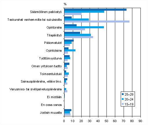 Vaikka nuoret saavat pääosan tuloistaan palkkatyöstä, vanhempien taloudellinen tuki jatkuu varsin pitkään. Se kohdistuu useimmiten alle 25-vuotiaisiin, pääkaupunkiseudulla asuviin sekä opiskeleviin tai työttömänä oleviin nuoriin eli niihin, jotka eniten tukea tarvitsevat. Nuorisobarometrin mukaan kuitenkin yli 60 prosenttia 25-29-vuotiaistakin saa vanhemmiltaan rahallista tukea ja noin kolmannekselle ikäryhmästä vanhemmat ostavat ruokaa ja vaatteita.