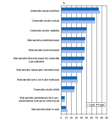 Vaikka tutkimukset ovat osoittaneet, että pojat saavat lapsena enemmän viikkorahaa kuin tytöt, eivät sukupuolen mukaiset erot juurikaan näy Nuorisobarometrin mukaan vanhemmilta saadussa taloudellisessa tuessa (kuvio 2). Kyselyn mukaan tytöt näyttävät saavan hieman poikia enemmän suoraa rahallista tukea. Pojat puolestaan saavat vanhemmiltaan tukea hieman tyttöjä enemmän suoraan kulutukseen kuten puhelinlaskuihin ja harrastuksiin. Saatua tulosta tukee myös se, että nuoret miehet saavat yleensä isompaa palkkaa kuin nuoret naiset, joten vanhempien suoraa rahallista tukea ei ole kenties tarpeen korostaa. Näin kulttuuri vahvistaa miehen roolia perheen elättäjänä jo nuorena.