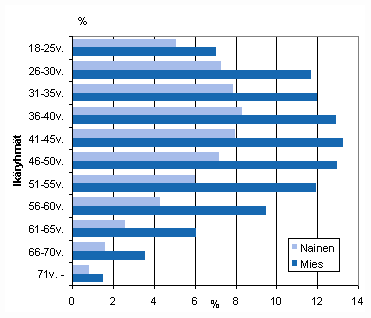 Kuvio 3. Maksuhäiriöiset iän ja sukupuolen mukaan, prosenttia vastaavanikäisestä väestöstä.