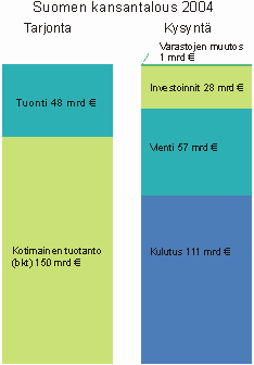 Tuotannon (eli kansantuotteen) kannalta on periaatteessa aivan sama, mistä eristä kysyntä muodostuu tai mikä kysyntäerä kasvaa nopeimmin. Tuotantoa ylläpitävät yhtä lailla kulutukseen, vientiin ja investointeihin käytetyt eurot. Vienti on tarpeen, jotta voimme tuoda sellaisia tavaroita ja palveluita, joita ei kotimaassa tuoteta tai jotka on muuten edullista ostaa ulkomailta. Investointeja taas tarvitaan, jotta voimme tulevaisuudessakin tuottaa.