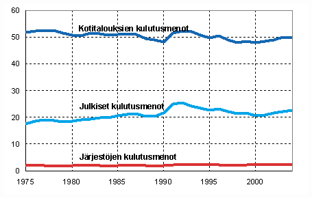 Kulutusmenot, prosenttia bruttokansantuotteesta 1975-2004