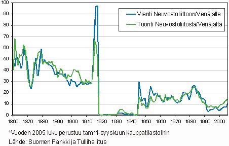 Kuvio 1. Venäjän ja Neuvostoliiton osuus Suomen ulkomaankaupasta 1860-2005*, prosenttia