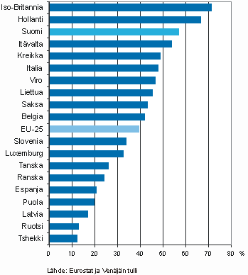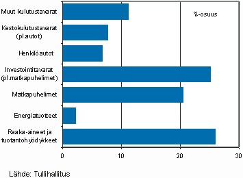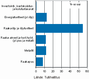 Suomen tuonti Venäjältä on keskittynyt pääasiassa energiatuotteisiin ja raaka-aineisiin (kuvio 4). Niitä jalostetaan Suomessa edelleen sekä kotimarkkinoiden että läntisten vientimarkkinoiden käyttöön. Energiatuotteiden osuus tuonnista on viime vuosina ollut noin kaksi kolmasosaa. Yksinään raakaöljyn osuus Venäjän-tuonnista oli 40 prosenttia tammi-syyskuussa ja öljytuotteiden 15 prosenttia. Venäjän osuus Suomen kokonaisöljyntuonnista oli 76 prosenttia vuonna 2004. Venäjän raakaöljy on heikomman laadun takia Brent-laatua halvempaa. Suomi onkin niitä harvoja Venäjän ulkopuolisia maita, joissa halvempaa venäläistä öljyä voidaan jalostaa tehokkaasti, mikä osaltaan tarjoaa suomalaisille öljyjalostamoille myös merkittävän kilpailuedun erityisesti öljyn hinnan ollessa korkealla. Lisäksi Suomeen tuodaan maakaasua pelkästään Venäjältä.