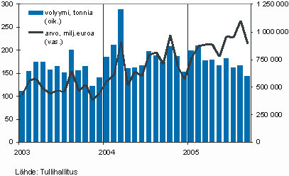 Suomen Venäjän-tuonnin rakenteesta johtuen Suomen kokonaistuonnin arvon ennustettavuutta vaikeuttaa raaka-aineiden ja energian maailmanmarkkinahintojen suuri vaihtelu. Esim. raakaöljyn tuonnin arvo kasvoi tammi-syyskuussa 31 prosenttia edellisestä vuodesta, mutta määrällisesti se laski 8 prosenttia samalla ajanjaksolla (kuvio 5). Suomen Venäjän-tuonnin kasvusta tammi-syyskuussa 2005 raakaöljyn arvon nousun osuus oli 44 prosenttia. Lähes puolet Suomen Venäjän-tuonnin kasvusta tammi-syyskuussa 2005 johtui siis raakaöljyn nopeasti kohonneista maailmamarkkinahinnoista eikä volyymin kasvusta.