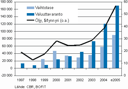 Öljystä ja raaka-aineista johtuneet vientitulot heijastuvat suoraan Venäjän ulkoiseen (kuvio 2) ja sisäiseen (kuvio 3) tasapainoon. Venäjän vaihtotaseen ylijäämä on ollut yli 10 prosenttia suhteessa kokonaistuotantoon, mikä kansainvälisessä vertailussa tarkoittaa tavattoman suurta ylijäämää. Parantuneiden talousnäkymien myötä myös pääomien ulosvirtaaminen Venäjältä on vähentynyt ja toisaalta venäläisyritysten pääsy kansainvälisille rahoitusmarkkinoille ja suorien sijoitusten lisääntyminen ovat tuoneet uusia pääomia Venäjälle. Pääomaliikkeiden tasapainottumisen myötä vaihtotaseen ylijäämä on aikaisempaa selvemmin kerryttänyt keskuspankin valuuttavarantoa. Venäjän valuuttavaranto oli viime vuoden lopulla 170 miljardin dollarin luokkaa, joten maan valuuttavaranto on tällä hetkellä Japanin, Kiinan ja muutaman muun Aasian maan jälkeen yksi maailman suurimmista.