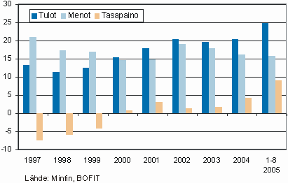 Vaihtotaseen tavoin Venäjän budjettitalous on päässyt nauttimaan ruhtinaallisista öljytuloista. Toistaiseksi finanssipolitiikka on kuitenkin ollut kurinalaista eikä budjettimenoja ole kasvatettu tulojen nousun tahdissa. Kun liittovaltion tulot ja menot suhteessa kokonaistuotantoon olivat vuosikymmenen alussa noin 15 prosenttia, viime vuonna tulot olivat 24 ja menot noin 17 prosenttia kokonaistuotannosta. Näin syntynyt budjettiylijäämä on sekin huippuluokkaa kansainvälisessä mitassa.