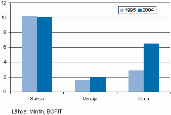 Viime vuosien nopeasta kasvusta huolimatta Venäjä on pystynyt kasvattamaan vain marginaalisesti osuuttaan maailmankaupassa (kuvio 4). Vaikka se on keskeinen toimija Euroopan ja Kiinan energia- ja raaka-ainehuollossa, sillä on ollut vaikeuksia kilpailla muilla tuotteilla ja investointien houkuttelemisessa kahden erilaisen talousjätin välissä. Venäjään verrattuna Kiinan markkinoiden kasvu on ylivertaista, työvoima paljon halvempaa ja teknisessä osaamisessakin Kiina on jo monin osin edellä. Eurooppa puolestaan edustaa suurten markkinoiden lisäksi korkean tuottavuuden ja teknologisen osaamisen kärkeä. On vaikea nähdä, että Venäjä pystyisi nykypolitiikalla vahvistamaan oleellisesti asemaansa Kiinan ja Euroopan unionin välissä muuna kuin energian ja raaka-aineiden tuottajana.