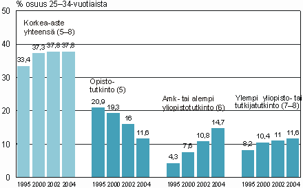 Korkea-asteen suorittaneiden osuus ei noussut 2000-luvun alkuvuosina. Syy tähän näkyy kuviosta 4. Korkea-asteelle luokiteltava niin sanotun opistotason koulutuksen (esimerkiksi teknikot, opistoasteen merkonomit ja sairaanhoitajat) suorittaneiden määrä väheni yhtä paljon kuin ammattikorkeakoulu- ja yliopistotutkinnon suorittaneiden määrä kasvoi. Poikkeuksellisen suuri väheneminen johtuu siitä, että opistoasteen koulutus lopetettiin 1990-luvun aikana ja siirrettiin ammattikorkeakoulutasolle. Korkea-asteen sisällä toteutuu tavoitteeksi asetettu koulutusasteen nousu, mutta toisaalta jonkin ajan kuluttua nuorimmissa ikäluokissa opistotason suorittaneita ei enää ole.