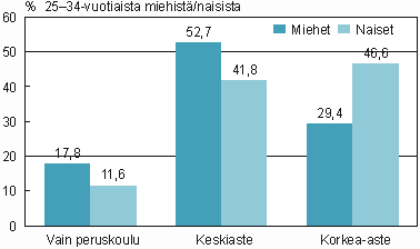 Miehiä oli 25-34-vuotiaassa väestössä 2,3 prosenttia enemmän kuin naisia vuonna 2004. Korkea-asteen tutkinnon suorittaneissa oli kuitenkin naisenemmistö. 25-34-vuotiaista naisista 46,6 prosenttia oli suorittanut korkea-asteen tutkinnon, mutta miehistä vain 29,4 prosenttia. Alemmilla koulutusasteilla oli miesenemmistö.