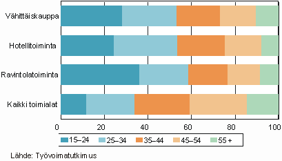 Vähittäiskaupan sekä hotelli- ja ravintolatoiminnan aloilla yli puolet palkansaajista on alle 35-vuotiaita. Yli 55-vuotias työntekijä on etenkin hotelli- ja ravintola-alalla harvinaisuus (kuvio 3). Ikäjakauma on selvästi nuorempi kuin palkansaajilla yleensä. Tästä johtuen osa-aikatyö on näillä toimialoilla usein nimenomaan opiskelun ohessa tehtävää työtä. Yli 15 prosenttia näillä aloilla työskentelevistä palkansaajista ilmoittaa pääasialliseksi toiminnakseen opiskelun, kun opiskelijoiden osuus kaikilla toimialoilla on noin viisi prosenttia.