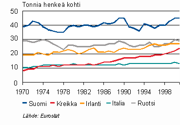 Suomessa kuluu asukasta kohti laskettuna vuodessa noin 45 tonnia erilaisia materiaaleja, kun muiden EU-maiden asukkaat selviävät 15-30 tonnilla (Kuvio 1).