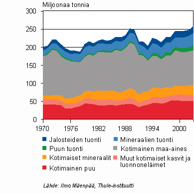 Kirjoittaja on yliaktuaari ympäristö- ja energiatilastoissa. Artikkeli perustuu pääasiassa Thule-instituutissa Ilmo Mäenpään johdolla tehtyihin toimialoittaisiin panos-tuotostaulukoihin ja aikasarjoihin Suomen luonnonvarojen kokonaiskäytöstä. Ilmo Mäenpää on ainevirtatilinpidon sekä ainevirtojen, ympäristön ja talouden vuorovaikutusta selittävän analysoinnin uranuurtaja Suomessa.