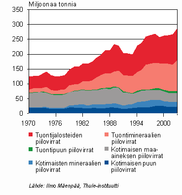 Käyttämistämme materiaaleista yli 70 prosenttia on peräisin Suomen luonnonvaroista. Tuonnin osuus on kuitenkin 1970-lukuun verrattuna kasvanut kaksinkertaiseksi. Kun suorien panosten käytön antamaa kuvaa Suomen taloudesta täydennetään kotimaisilla ja tuonnin piilovirroilla, tuonnin merkitys kasvaa voimakkaasti (Kuvio 3). Tuontiin liittyvät piilovirrat ovat kolmen vuosikymmenen aikana lähes nelinkertaistuneet. Globalisaatiota tämäkin.