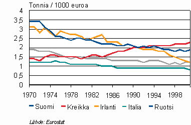 Suomea näyttävämpään kehitykseen on materiaali-intensiteetissä pystynyt vain Irlanti, jossa lasku ei ole hiipunut kuten Suomessa. Molemmissa maissa talouskasvu on ollut nopeampaa kuin suorien ainepanosten käytön kasvu. Tosin Suomessa myös ainepanosten käyttö on vielä selvästi kasvanut 2000-luvulla.