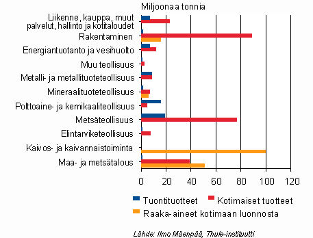 Kuvaa Suomen talouden ainekäytön rakenteesta voidaan tarkentaa esittämällä toimialaryhmittäin sekä suorien ainepanosten käyttö että kotimaisten tuotteiden käyttö taloudessa (Kuvio 5). Tässä tarkastelussa esimerkiksi metsätalouden korjaama puu näkyy myös kotimaisena tuotepanoksena metsäteollisuudessa ja kaivannaistoiminnan ottama sora ja murske rakentamisessa käytettävänä tuotteena. Suurimmat ainepanokset keskittyvät toimialaryhmiin, joiden tuotteiden arvo niiden painoon verrattuna on varsin pieni ja johtaa korkeaan materiaali-intensiteettiin.