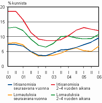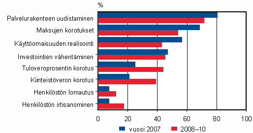Palvelurakenteen uudistamisen oli aloittamassa 81 prosenttia kunnista. Uudistamishalukkaiden määrä on lisääntynyt 16 prosenttiyksikköä aiempaan verrattuna. Aikeet lisätä kuntien käyttöomaisuuden realisointia, kiinteistöveron korotuspaineen lasku sekä myös tuloveroprosentin korotuspaineen lasku kunnissa olivat myös muutosta aikaisempaan. Tuloveroprosentin korotuksen ja kiinteistöveron korotuspaineen arveltiin siirtyvän vuosille 2008-2010, kuten kuviosta 1 on nähtävissä.