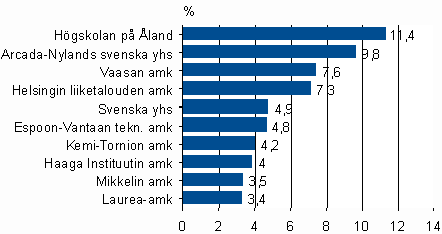Ammattikorkeakouluista eniten ulkomaalaisia opiskelijoita houkuttavat ruotsinkieliset ja rannikon ruotsinkielisillä alueilla toimivat koulut. Kärkisijoitusta ei niinkään selitä ruotsalaisten määrä - Ahvenanmaan ammattikorkeakoulua lukuun ottamatta - vaan koulujen painotus liiketalouteen ja tekniikkaan.