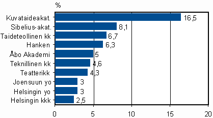Yliopistotasolla ulkomaalaiset ovat osoittaneet kaikkein suurinta kiinnostusta taidealalle. Kaikki neljä taidekoulua ovat kärkipäässä, kun kiinnostusta mitataan ulkomaalaisten suhteellisella osuudella kaikista opiskelijoista. Taideyliopistot ovat kuitenkin luonteeltaan huonosti verrattavissa muihin korkeakouluihin ja niitä tulisikin verrata lähinnä muiden maiden vastaaviin laitoksiin. Lisäksi absoluuttinen opiskelijamäärä on aika alhainen: yhteenlaskettu ulkomaalaisten määrä taideaineissa on alle 300 henkeä.