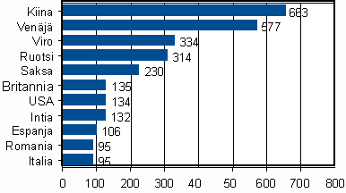Kiina ja Venäjä erottuvat selvästi ylitse muiden opiskelijoiden lähtömaina. Ulkomaalaisista korkeakouluopiskelijoista suurin osa on kiinalaisia, vuonna 2004 heitä oli 663 henkilöä. Venäläiset ovat toiseksi suurin ulkomaalaisten ryhmä Suomen korkeakouluopiskelijoista. Kaikkien koulutustasojen ulkomaalaisista opiskelijoista venäläiset olivat kuitenkin ylivoimaisesti suurin ryhmä vuonna 2004 (3 910).