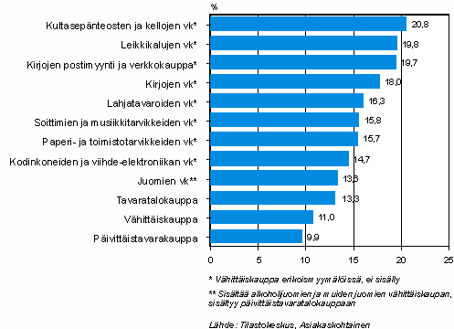Erikoiskaupat kilpailevat tavaratalojen kanssa samoista asiakkaista joulukuussa. Kodinkoneiden ja viihde-elektroniikan myyntiin erikoistuneiden liikkeiden liikevaihto lähes tuplaantuu joulukuussa verrattuna vuoden keskimääräiseen kuukausimyyntiin. Kirjakaupoissa sekä kirjojen postimyynnissä ja verkkokaupassa että leikkikalukaupassa kertyy lähes viidennes vuoden myynnistä joulukuussa. Kulta- ja kelloliikkeissä jopa yli viidesosa vuoden myynnistä tulee joulukuulta.