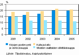 Tietyillä erikoiskaupan toimialoilla joulukuun painoarvo suhteessa koko vuoden myyntiin on kuitenkin kohonnut entisestään vuosina 2000-2005. Varsinkin kirjojen postimyynnissä ja verkkokaupassa sekä kultasepänteosten ja kellojen vähittäiskaupassa joulukuulla on ollut viime vuosina entistä suurempi merkitys koko vuoden myynnille. Esimerkiksi kirjojen postimyynti ja verkkokauppa joulukuussa 2001 kerrytti 15 prosenttia myynnistä, kun viime jouluna sen osuus oli melkein 20 prosenttia koko vuoden myynnistä. Osuuden kasvun taustalla on kirjojen postimyynnin ja verkkokaupan vaisu vuosimyynnin kehitys.