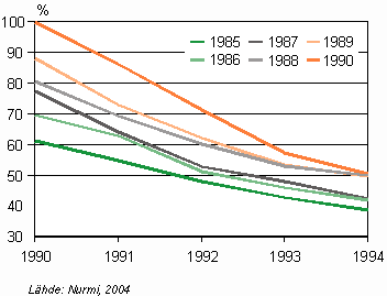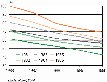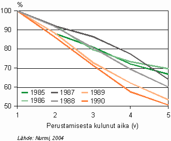 Henkiinjäämistä voidaan tarkastella myös kohorteittain eli tarkastelemalla kunakin vuonna syntyneitä toimipaikkoja erikseen. Erityisen kiinnostuksen kohteena on suhdanteiden vaikutus eri vuosina syntyneisiin toimipaikkoihin. Kun tarkastellaan teollisia vähintään viiden henkilön toimipaikkoja (toimialat 15-37), havaitaan, että juuri ennen lamaa vuosina 1989-90 syntyneitä teollisia toimipaikkoja on kohdannut suurempi kato ensimmäisten toimintavuosien aikana kuin aiempina vuosina syntyneitä toimipaikkoja (Kuvio 1). Vuonna 1990 syntyneistä toimipaikoista on jäljellä neljän vuoden jälkeen noin puolet, kun taas ennen nousukautta vuosina 1985-86 syntyneistä toimipaikoista on jäljellä lähes 70 prosenttia. Näyttäisi siis siltä, että elinkaaren alkuvaiheessa henkiinjääminen on erityisen herkkää suhdannevaihteluiden vaikutukselle. Herää kuitenkin kysymys, koetteliko lama nuoria ja hieman vanhempia toimipaikkoja eri tavoin?